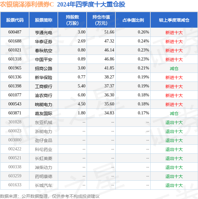 从基金规模来看,农银瑞泽添利债券C基金2024年四季度公布的基金规模为0.18亿元,较上一期规模3055.21万元变化了-1220.53万元,环比变化了-39.95%。该基金最新一期资产配置为:股票占净值比11.87%,债券占净值比95.04%,现金占净值比2.88%。从基金持仓来看,该基金当季前十大股票仓位达2.08%,第一大重仓股为亨通光电(600487),持仓占比为0.26%。
