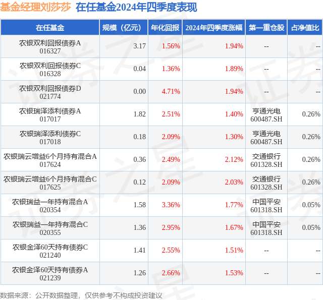 农银瑞泽添利债券C现任基金经理为刘莎莎 钱大千。其中在任基金经理刘莎莎已从业6年又354天,2022年12月22日正式接手管理农银瑞泽添利债券C,任职期间累计回报为4.41%。目前还管理着11只基金产品(包括A类和C类),其中本季度表现最佳的基金为农银瑞云增益6个月持有混合A(017624),季度净值涨幅为2.12%。