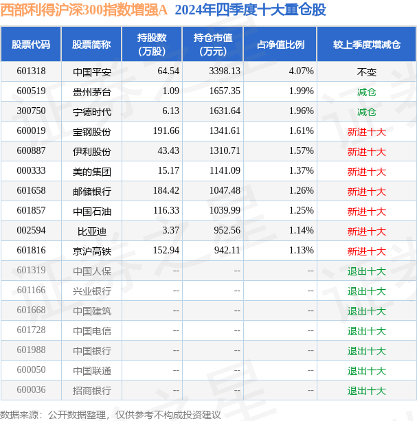从基金规模来看,西部利得沪深300指数增强A基金2024年四季度公布的基金规模为4.81亿元,较上一期规模5.44亿元变化了-6314.23万元,环比变化了-11.61%。该基金最新一期资产配置为:股票占净值比86.27%,无债券类资产,现金占净值比13.06%。从基金持仓来看,该基金当季前十大股票仓位达17.35%,第一大重仓股为中国平安(601318),持仓占比为4.07%。