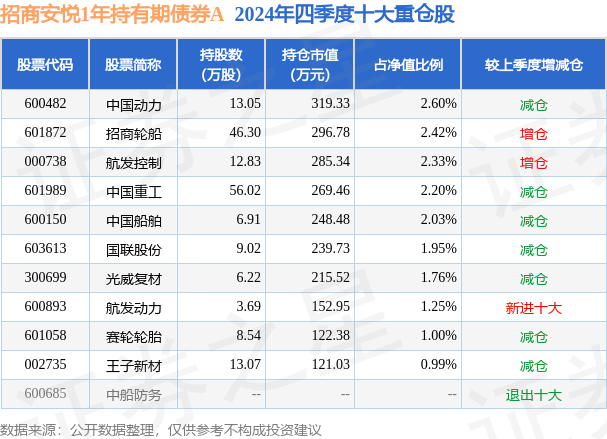 从基金规模来看,招商安悦1年持有期债券A基金2024年四季度公布的基金规模为0.66亿元,较上一期规模7967.01万元变化了-1358.39万元,环比变化了-17.05%。该基金最新一期资产配置为:股票占净值比19.69%,债券占净值比110.54%,现金占净值比0.63%。从基金持仓来看,该基金当季前十大股票仓位达18.53%,第一大重仓股为中国动力(600482),持仓占比为2.6%。