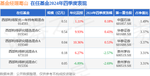 西部利得新润混合A现任基金经理为葛山。其中在任基金经理葛山已从业0年又295天,2024年4月29日正式接手管理西部利得新润混合A,任职期间累计回报为13.84%。目前还管理着5只基金产品(包括A类和C类),其中本季度表现最佳的基金为西部利得研究精选混合A(019340),季度净值涨幅为0.53%。