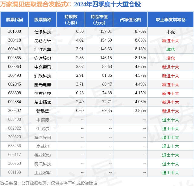 从基金规模来看,万家洞见进取混合发起式C基金2024年四季度公布的基金规模为0.06亿元,较上一期规模675.97万元变化了-111.74万元,环比变化了-16.53%。该基金最新一期资产配置为:股票占净值比95.3%,无债券类资产,现金占净值比8.73%。从基金持仓来看,该基金当季前十大股票仓位达59.53%,第一大重仓股为仕净科技(301030),持仓占比为8.76%。