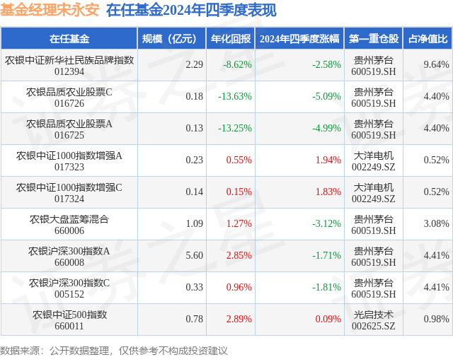 证券之星消息,日前农银品质农业股票A基金公布四季报,2024年四季度最新规模0.13亿元,季度净值涨幅为-4.99%。