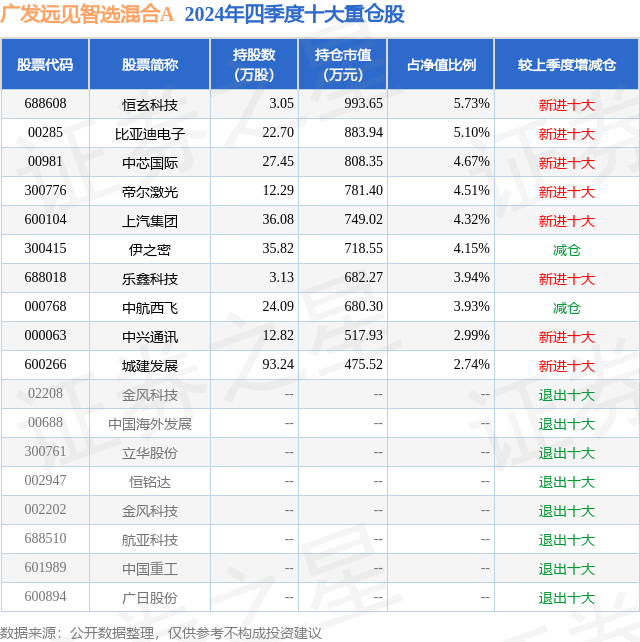 从基金规模来看,广发远见智选混合A基金2024年四季度公布的基金规模为0.71亿元,较上一期规模7396.31万元变化了-257.74万元,环比变化了-3.48%。该基金最新一期资产配置为:股票占净值比88.67%,债券占净值比0.08%,现金占净值比16.14%。从基金持仓来看,该基金当季前十大股票仓位达42.08%,第一大重仓股为恒玄科技(688608),持仓占比为5.73%。