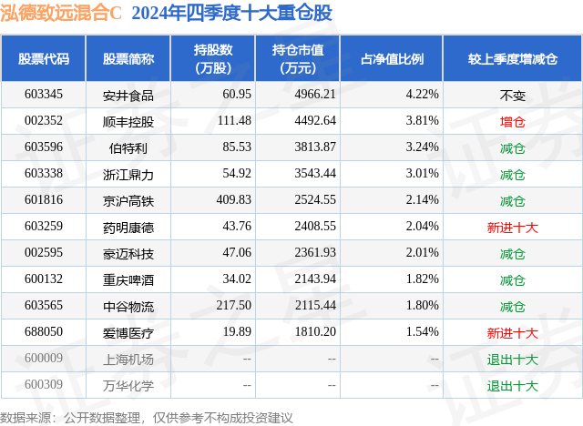 从基金规模来看,泓德致远混合C基金2024年四季度公布的基金规模为1.46亿元,较上一期规模1.61亿元变化了-1484.94万元,环比变化了-9.23%。该基金最新一期资产配置为:股票占净值比44.24%,债券占净值比15.08%,现金占净值比23.98%。从基金持仓来看,该基金当季前十大股票仓位达25.63%,第一大重仓股为安井食品(603345),持仓占比为4.22%。