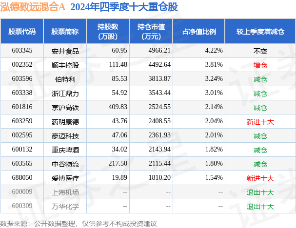 从基金规模来看,泓德致远混合A基金2024年四季度公布的基金规模为10.32亿元,较上一期规模11.19亿元变化了-8731.49万元,环比变化了-7.8%。该基金最新一期资产配置为:股票占净值比44.24%,债券占净值比15.08%,现金占净值比23.98%。从基金持仓来看,该基金当季前十大股票仓位达25.63%,第一大重仓股为安井食品(603345),持仓占比为4.22%。