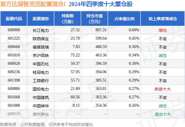 从基金规模来看,易方达瑞智灵活配置混合I基金2024年四季度公布的基金规模为5.26亿元,较上一期规模5.2亿元变化了580.51万元,环比变化了1.12%。该基金最新一期资产配置为:股票占净值比5.97%,债券占净值比110.78%,现金占净值比1.73%。从基金持仓来看,该基金当季前十大股票仓位达3.43%,第一大重仓股为长江电力(600900),持仓占比为0.6%。
