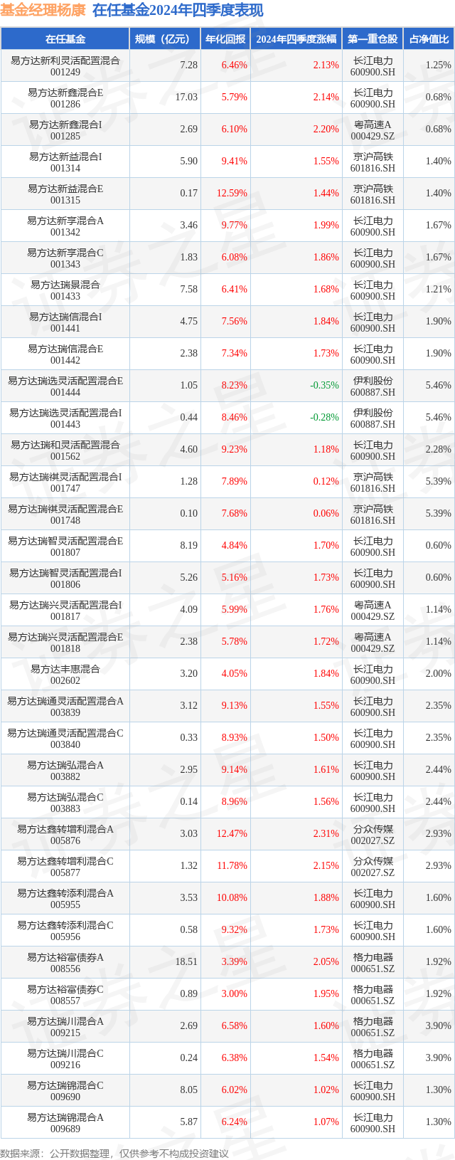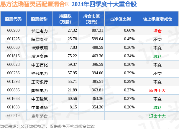从基金规模来看,易方达瑞智灵活配置混合E基金2024年四季度公布的基金规模为8.19亿元,较上一期规模2.5亿元变化了5.68亿元,环比变化了227.15%。该基金最新一期资产配置为:股票占净值比5.97%,债券占净值比110.78%,现金占净值比1.73%。从基金持仓来看,该基金当季前十大股票仓位达3.43%,第一大重仓股为长江电力(600900),持仓占比为0.6%。