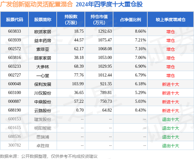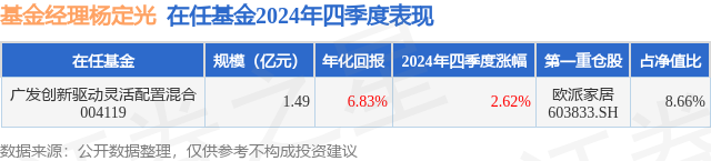 从基金规模来看,广发创新驱动灵活配置混合基金2024年四季度公布的基金规模为1.49亿元,较上一期规模1.48亿元变化了139.36万元,环比变化了0.94%。该基金最新一期资产配置为:股票占净值比61.07%,无债券类资产,现金占净值比39.36%。从基金持仓来看,该基金当季前十大股票仓位达60.71%,第一大重仓股为欧派家居(603833),持仓占比为8.66%。
