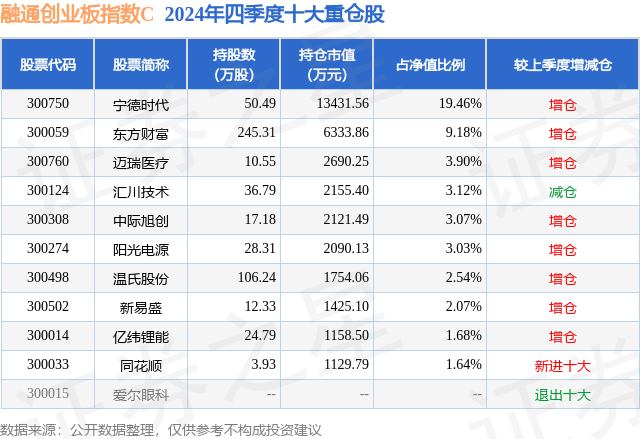 从基金规模来看,融通创业板指数C基金2024年四季度公布的基金规模为1.07亿元,较上一期规模1.07亿元变化了-9.76万元,环比变化了-0.09%。该基金最新一期资产配置为:股票占净值比94.32%,无债券类资产,现金占净值比6.41%。从基金持仓来看,该基金当季前十大股票仓位达49.69%,第一大重仓股为宁德时代(300750),持仓占比为19.46%。