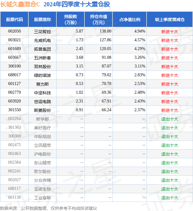 从基金规模来看,长城久鑫混合C基金2024年四季度公布的基金规模为0.0亿元,较上一期规模14.69万元变化了0.16万元,环比变化了1.09%。该基金最新一期资产配置为:股票占净值比88.2%,无债券类资产,现金占净值比12.32%。从基金持仓来看,该基金当季前十大股票仓位达32.81%,第一大重仓股为三花智控(002050),持仓占比为4.94%。