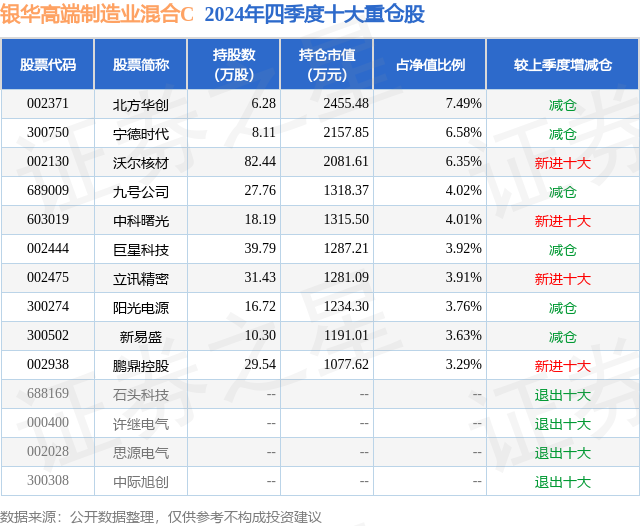 证券之星消息,日前银华高端制造业混合C基金公布四季报,2024年四季度最新规模0.02亿元,季度净值涨幅为-0.18%。