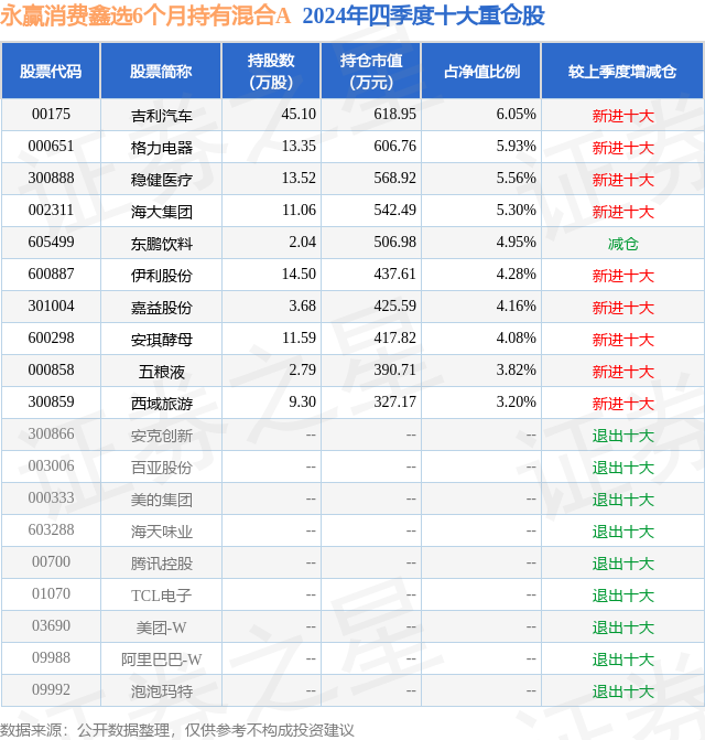 从基金规模来看,永赢消费鑫选6个月持有混合A基金2024年四季度公布的基金规模为0.37亿元,较上一期规模6343.38万元变化了-2692.08万元,环比变化了-42.44%。该基金最新一期资产配置为:股票占净值比87.12%,无债券类资产,现金占净值比14.8%。从基金持仓来看,该基金当季前十大股票仓位达47.33%,第一大重仓股为吉利汽车(00175),持仓占比为6.05%。