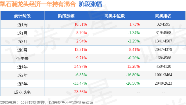 从业绩表现来看,凯石澜龙头经济一年持有混合基金过去一年净值涨幅为34.97%,在同类基金中排名450/4120,同类基金过去一年净值涨幅中位数为15.28%。而基金过去一年的最大回撤为-19.74%,成立以来的最大回撤为-62.62%。