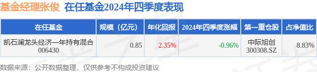 证券之星消息,日前凯石澜龙头经济一年持有混合基金公布四季报,2024年四季度最新规模0.85亿元,季度净值涨幅为-0.96%。