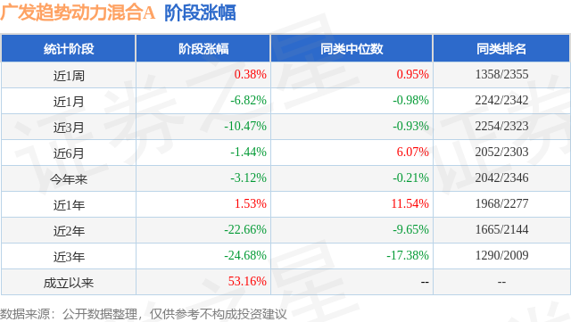 从业绩表现来看,广发趋势动力混合A基金过去一年净值涨幅为1.53%,在同类基金中排名1968/2277,同类基金过去一年净值涨幅中位数为11.54%。而基金过去一年的最大回撤为-17.86%,成立以来的最大回撤为-38.4%。