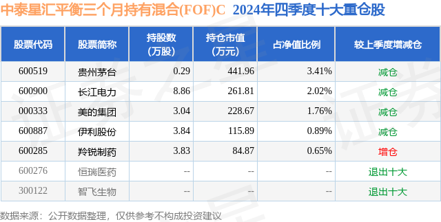 证券之星消息,日前中泰星汇平衡三个月持有混合(FOF)C基金公布四季报,2024年四季度最新规模0.8亿元,季度净值涨幅为-1.65%。