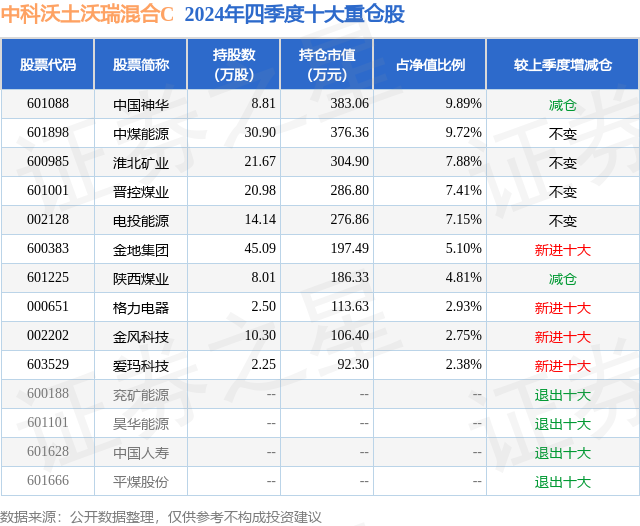 从基金规模来看,中科沃土沃瑞混合C基金2024年四季度公布的基金规模为0.19亿元,较上一期规模2337.73万元变化了-438.75万元,环比变化了-18.77%。该基金最新一期资产配置为:股票占净值比88.51%,债券占净值比2.9%,现金占净值比9.23%。从基金持仓来看,该基金当季前十大股票仓位达60.02%,第一大重仓股为中国神华(601088),持仓占比为9.89%。