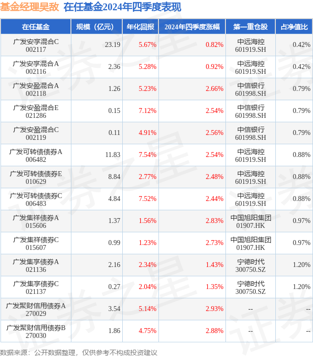 证券之星消息,日前广发可转债债券A基金公布四季报,2024年四季度最新规模11.83亿元,季度净值涨幅为2.54%。