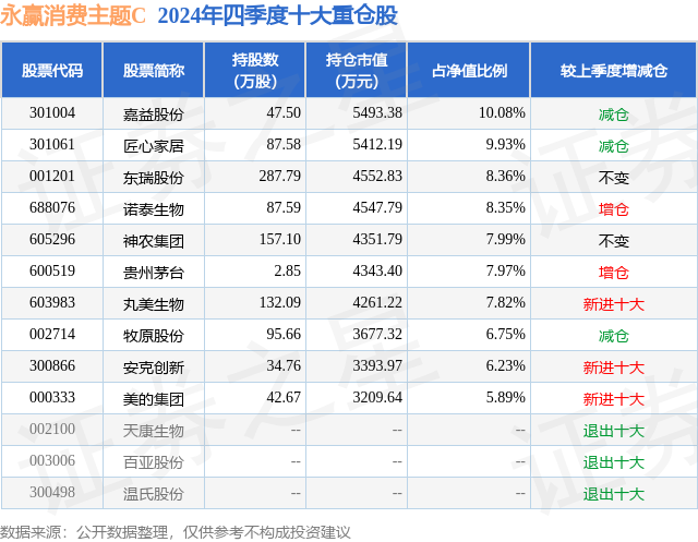 从基金规模来看,永赢消费主题C基金2024年四季度公布的基金规模为2.0亿元,较上一期规模2.26亿元变化了-2586.82万元,环比变化了-11.45%。该基金最新一期资产配置为:股票占净值比89.17%,无债券类资产,现金占净值比9.59%。从基金持仓来看,该基金当季前十大股票仓位达79.37%,第一大重仓股为嘉益股份(301004),持仓占比为10.08%。