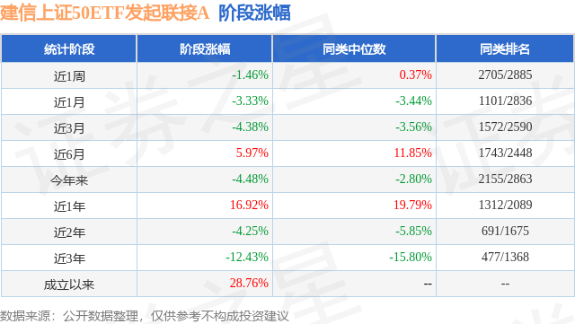 从业绩表现来看,建信上证50ETF发起联接A基金过去一年净值涨幅为16.92%,在同类基金中排名1312/2089,同类基金过去一年净值涨幅中位数为19.79%。而基金过去一年的最大回撤为-9.84%,成立以来的最大回撤为-37.85%。