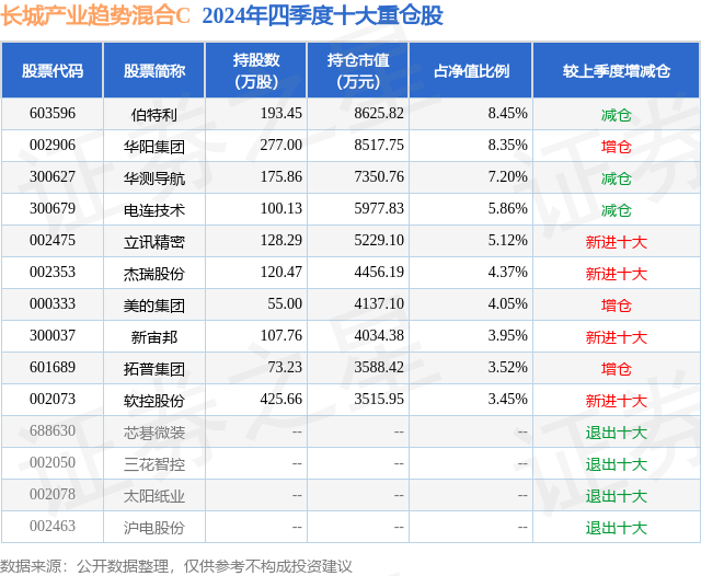 从基金规模来看,长城产业趋势混合C基金2024年四季度公布的基金规模为0.24亿元,较上一期规模2432.83万元变化了-78.63万元,环比变化了-3.23%。该基金最新一期资产配置为:股票占净值比84.12%,债券占净值比5.53%,现金占净值比10.68%。从基金持仓来看,该基金当季前十大股票仓位达54.32%,第一大重仓股为伯特利(603596),持仓占比为8.45%。