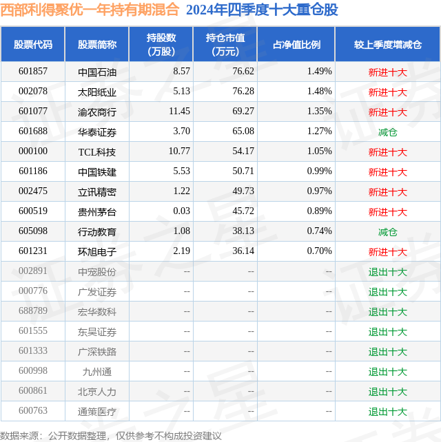 从基金规模来看,西部利得聚优一年持有期混合基金2024年四季度公布的基金规模为0.51亿元,较上一期规模5617.55万元变化了-474.85万元,环比变化了-8.45%。该基金最新一期资产配置为:股票占净值比14.52%,债券占净值比56.91%,现金占净值比11.67%。从基金持仓来看,该基金当季前十大股票仓位达10.93%,第一大重仓股为中国石油(601857),持仓占比为1.49%。
