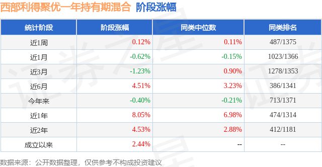 从业绩表现来看,西部利得聚优一年持有期混合基金过去一年净值涨幅为8.05%,在同类基金中排名474/1314,同类基金过去一年净值涨幅中位数为6.98%。而基金过去一年的最大回撤为-2.08%,成立以来的最大回撤为-5.46%。
