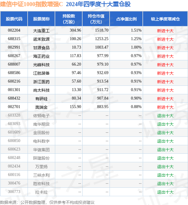 从基金规模来看,建信中证1000指数增强C基金2024年四季度公布的基金规模为2.99亿元,较上一期规模6.14亿元变化了-3.15亿元,环比变化了-51.38%。该基金最新一期资产配置为:股票占净值比84.4%,无债券类资产,现金占净值比14.37%。从基金持仓来看,该基金当季前十大股票仓位达10.23%,第一大重仓股为大连重工(002204),持仓占比为1.51%。