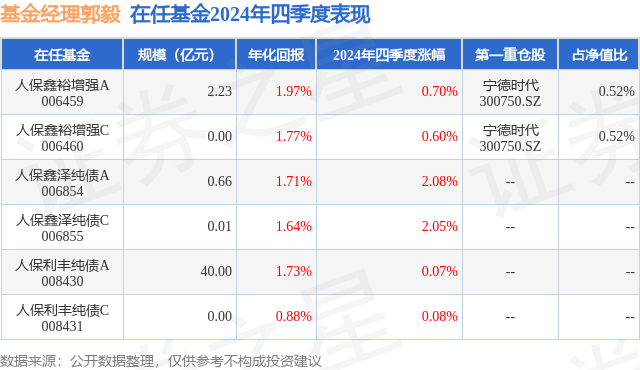 人保鑫裕增强A现任基金经理为郭毅。其中在任基金经理郭毅已从业1年又362天,2024年9月2日正式接手管理人保鑫裕增强A,任职期间累计回报为3.04%。目前还管理着6只基金产品(包括A类和C类),其中本季度表现最佳的基金为人保鑫泽纯债A(006854),季度净值涨幅为2.08%。