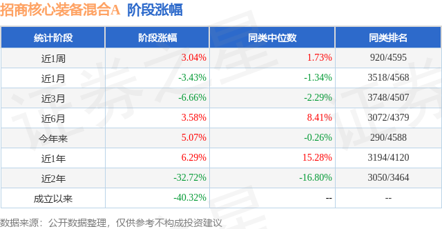 从业绩表现来看,招商核心装备混合A基金过去一年净值涨幅为6.29%,在同类基金中排名3194/4120,同类基金过去一年净值涨幅中位数为15.28%。而基金过去一年的最大回撤为-23.04%,成立以来的最大回撤为-51.77%。