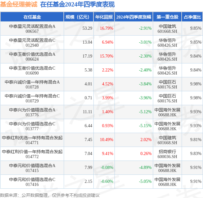 中泰玉衡价值优选混合A现任基金经理为姜诚。其中在任基金经理姜诚已从业7年又293天,2019年3月20日正式接手管理中泰玉衡价值优选混合A,任职期间累计回报为134.58%。目前还管理着12只基金产品(包括A类和C类),其中本季度表现最佳的基金为中泰红利优选一年持有混合发起(014771),季度净值涨幅为2.02%。