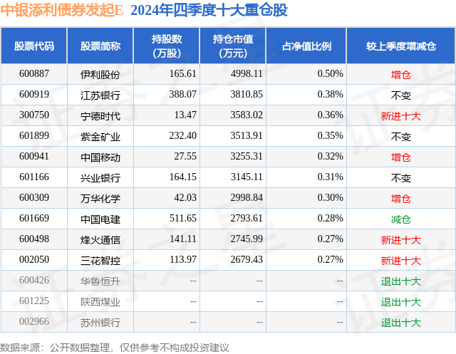 从基金规模来看,中银添利债券发起E基金2024年四季度公布的基金规模为46.02亿元,较上一期规模27.22亿元变化了18.81亿元,环比变化了69.11%。该基金最新一期资产配置为:股票占净值比5.46%,债券占净值比108.95%,现金占净值比1.89%。从基金持仓来看,该基金当季前十大股票仓位达3.34%,第一大重仓股为伊利股份(600887),持仓占比为0.5%。