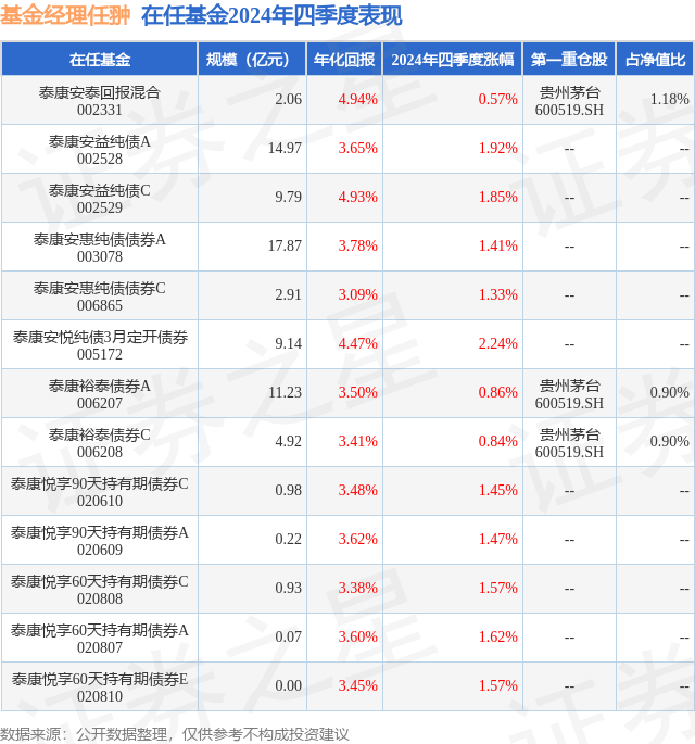 从基金规模来看,泰康裕泰债券C基金2024年四季度公布的基金规模为4.92亿元,较上一期规模2.78亿元变化了2.14亿元,环比变化了77.16%。该基金最新一期资产配置为:股票占净值比10.25%,债券占净值比85.49%,现金占净值比1.66%。从基金持仓来看,该基金当季前十大股票仓位达5.66%,第一大重仓股为贵州茅台(600519),持仓占比为0.9%。