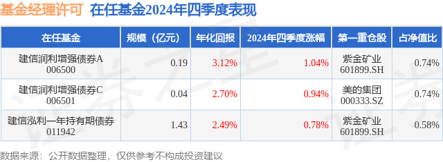 证券之星消息,日前建信润利增强债券C基金公布四季报,2024年四季度最新规模0.04亿元,季度净值涨幅为0.94%。