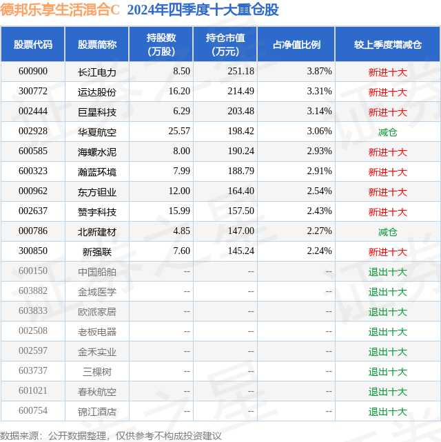 从基金规模来看,德邦乐享生活混合C基金2024年四季度公布的基金规模为0.21亿元,较上一期规模2322.07万元变化了-182.13万元,环比变化了-7.84%。该基金最新一期资产配置为:股票占净值比85.74%,无债券类资产,现金占净值比14.08%。从基金持仓来看,该基金当季前十大股票仓位达28.7%,第一大重仓股为长江电力(600900),持仓占比为3.87%。