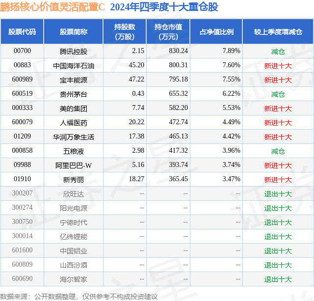 对本季度基金运作,基金经理的观点如下:2024年4季度,A股市场高开低走,10月第一个交易日开盘在季度最高点,随之而来的是大幅调整,沪深300指数季度收跌2.06%,恒生指数冲高回落,季度收跌5.08%。4季度整个市场表现为AI概念、零售概念等相关板块十分活跃,其他板块表现一般。 操作方面,本基金本报告期内进行了一些调仓,但整体变化不大。加仓了海上油气公司、CXO公司、互联网公司,减仓了部分制造业公司。 目前时点上,政策刺激还没有给经济带来很大的变化,复苏的道路依然较长。我们选股的标准仍然是以3年以上的维度来思考问题,选出长期能够带给股东回报的公司。虽然AI产业链、零售板块有边际上的变化,但我们评估了企业的长期核心竞争力以及对应的估值水平,没有作出调仓。