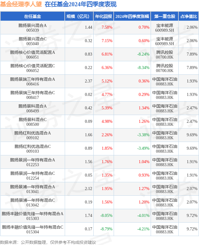 从基金规模来看,鹏扬核心价值灵活配置C基金2024年四季度公布的基金规模为0.22亿元,较上一期规模3013.34万元变化了-777.04万元,环比变化了-25.79%。该基金最新一期资产配置为:股票占净值比92.31%,债券占净值比5.53%,现金占净值比4.55%。从基金持仓来看,该基金当季前十大股票仓位达54.87%,第一大重仓股为腾讯控股(00700),持仓占比为7.89%。