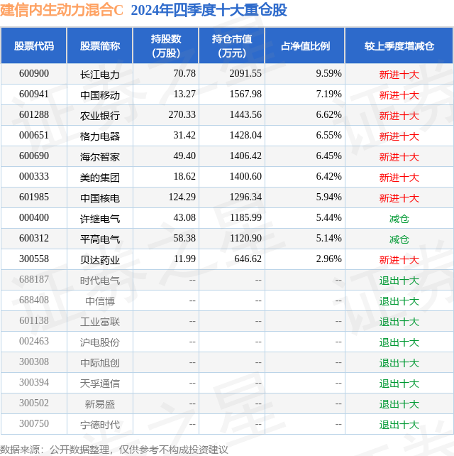 从基金规模来看,建信内生动力混合C基金2024年四季度公布的基金规模为0.05亿元,较上一期规模57.92万元变化了435.26万元,环比变化了751.45%。该基金最新一期资产配置为:股票占净值比69.79%,无债券类资产,现金占净值比31.21%。从基金持仓来看,该基金当季前十大股票仓位达62.3%,第一大重仓股为长江电力(600900),持仓占比为9.59%。