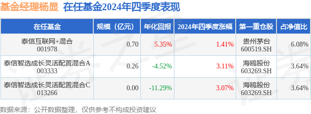 泰信智选成长灵活配置混合C现任基金经理为杨显。其中在任基金经理杨显已从业0年又232天,2024年6月4日正式接手管理泰信智选成长灵活配置混合C,任职期间累计回报为3.16%。目前还管理着3只基金产品(包括A类和C类),其中本季度表现最佳的基金为泰信智选成长灵活配置混合A(003333),季度净值涨幅为3.11%。