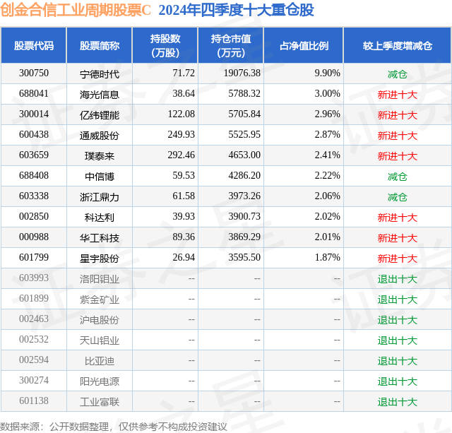 从基金规模来看,创金合信工业周期股票C基金2024年四季度公布的基金规模为6.89亿元,较上一期规模8.33亿元变化了-1.44亿元,环比变化了-17.29%。该基金最新一期资产配置为:股票占净值比92.05%,无债券类资产,现金占净值比8.63%。从基金持仓来看,该基金当季前十大股票仓位达31.32%,第一大重仓股为宁德时代(300750),持仓占比为9.9%。
