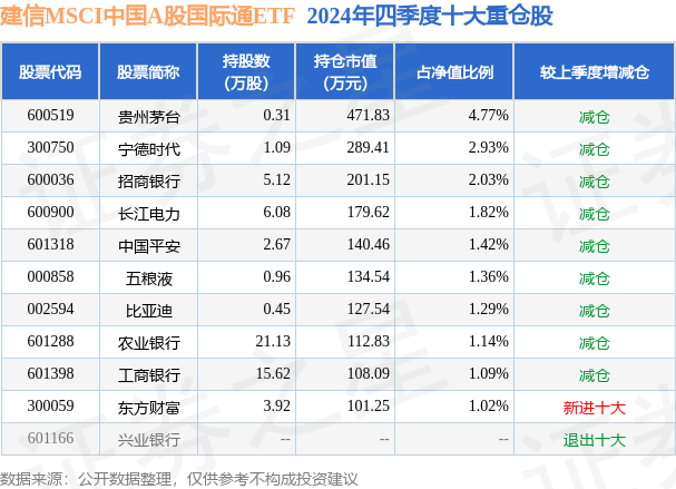 从基金规模来看,建信MSCI中国A股国际通ETF基金2024年四季度公布的基金规模为0.99亿元,较上一期规模1.18亿元变化了-1961.1万元,环比变化了-16.55%。该基金最新一期资产配置为:股票占净值比97.49%,无债券类资产,现金占净值比2.76%。从基金持仓来看,该基金当季前十大股票仓位达18.87%,第一大重仓股为贵州茅台(600519),持仓占比为4.77%。