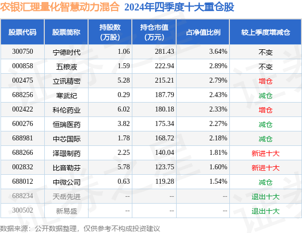 证券之星消息,日前农银汇理量化智慧动力混合基金公布四季报,2024年四季度最新规模0.77亿元,季度净值涨幅为1.7%。