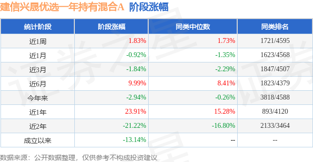从业绩表现来看,建信兴晟优选一年持有混合A基金过去一年净值涨幅为23.91%,在同类基金中排名893/4120,同类基金过去一年净值涨幅中位数为15.28%。而基金过去一年的最大回撤为-20.21%,成立以来的最大回撤为-41.4%。
