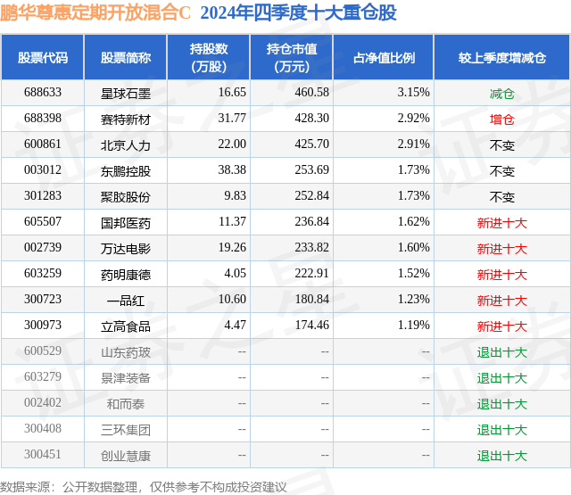 从基金规模来看,鹏华尊惠定期开放混合C基金2024年四季度公布的基金规模为0.16亿元,较上一期规模1558.06万元变化了16.82万元,环比变化了1.08%。该基金最新一期资产配置为:股票占净值比36.02%,债券占净值比66.4%,现金占净值比1.08%。从基金持仓来看,该基金当季前十大股票仓位达19.6%,第一大重仓股为星球石墨(688633),持仓占比为3.15%。
