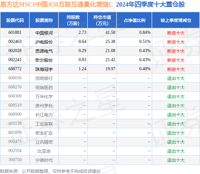 从基金规模来看,易方达MSCI中国A50互联互通量化增强C基金2024年四季度公布的基金规模为0.11亿元,较上一期规模1368.9万元变化了-276.27万元,环比变化了-20.18%。该基金最新一期资产配置为:股票占净值比93.26%,无债券类资产,现金占净值比7.65%。从基金持仓来看,该基金当季前十大股票仓位达2.61%,第一大重仓股为中国银河(601881),持仓占比为0.84%。