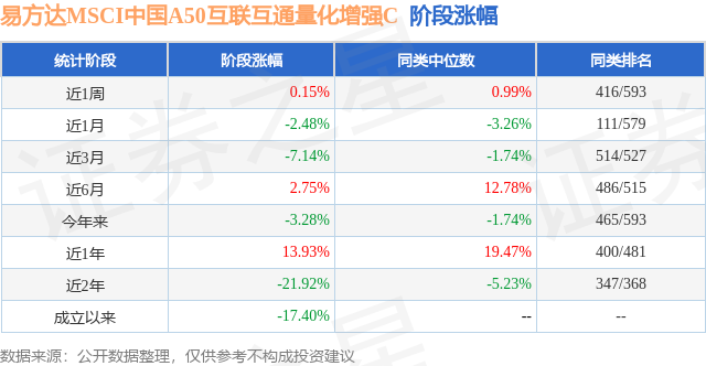 从业绩表现来看,易方达MSCI中国A50互联互通量化增强C基金过去一年净值涨幅为13.93%,在同类基金中排名400/481,同类基金过去一年净值涨幅中位数为19.47%。而基金过去一年的最大回撤为-14.01%,成立以来的最大回撤为-34.42%。
