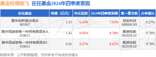 从基金规模来看,鹏华创新驱动混合基金2024年四季度公布的基金规模为1.53亿元,较上一期规模1.49亿元变化了381.94万元,环比变化了2.57%。该基金最新一期资产配置为:股票占净值比94.43%,无债券类资产,现金占净值比5.68%。从基金持仓来看,该基金当季前十大股票仓位达89.1%,第一大重仓股为恒玄科技(688608),持仓占比为9.27%。