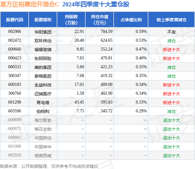 证券之星消息,日前易方达裕惠定开混合C基金公布四季报,2024年四季度最新规模0.18亿元,季度净值涨幅为3.21%。