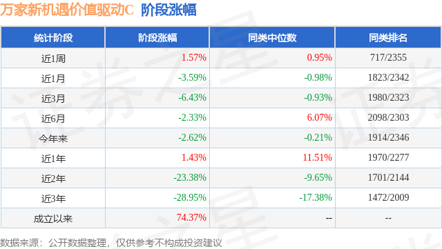 从业绩表现来看,万家新机遇价值驱动C基金过去一年净值涨幅为1.43%,在同类基金中排名1970/2277,同类基金过去一年净值涨幅中位数为11.51%。而基金过去一年的最大回撤为-15.54%,成立以来的最大回撤为-40.79%。